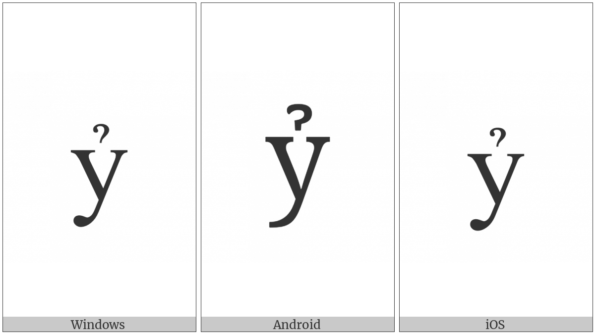 The image below shows how the “Latin Small Letter Y With Hook Above” symbol might look like on different operating systems. If the font in which this web site is displayed does not contain the symbol and there is no fallback font able to render it, you can use the image below to get an idea of what it should look like.