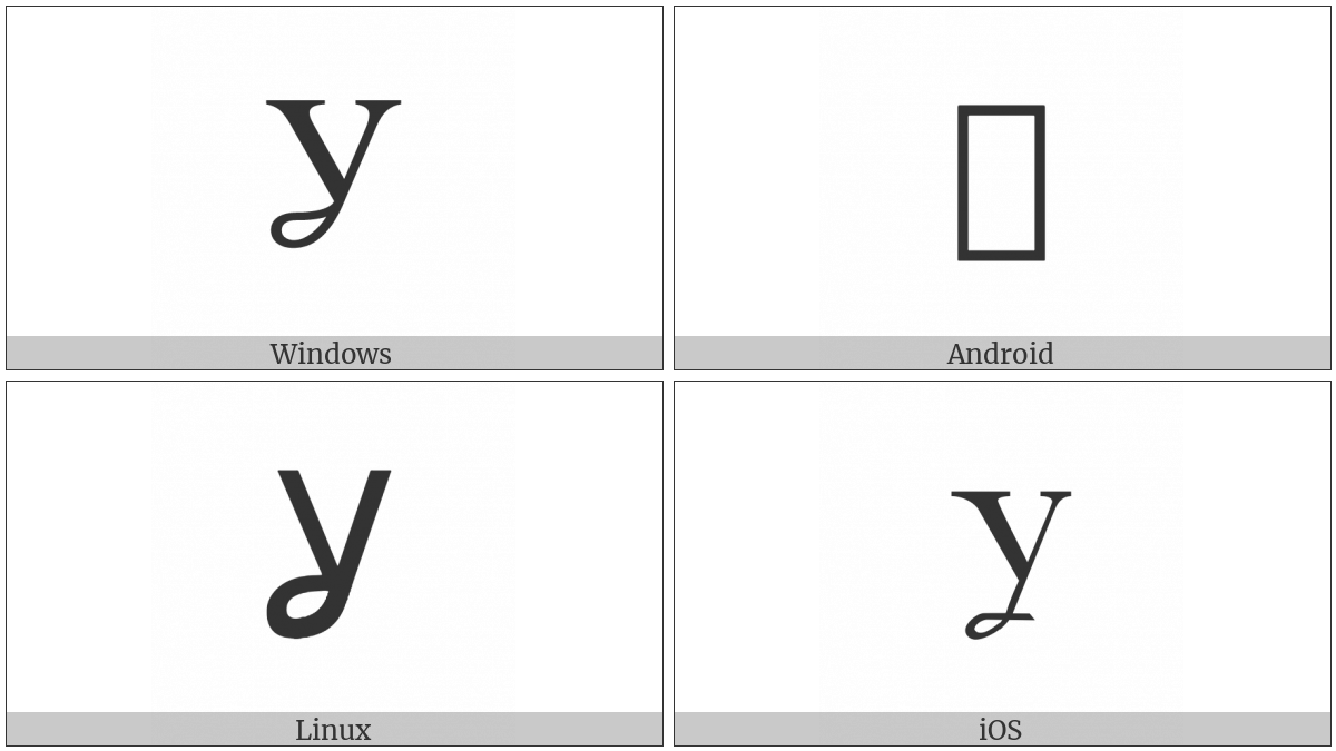 The image below shows how the “Latin Capital Letter Y With Loop” symbol might look like on different operating systems. If the font in which this web site is displayed does not contain the symbol and there is no fallback font able to render it, you can use the image below to get an idea of what it should look like.