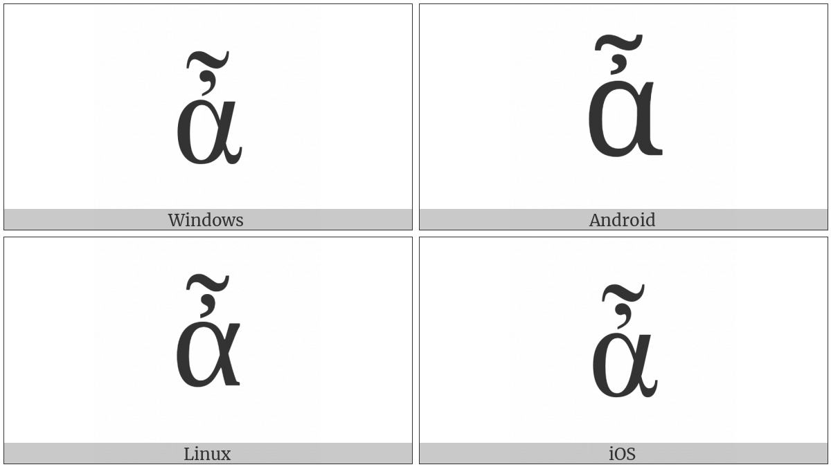 The image below shows how the “Greek Small Letter Alpha With Psili And Perispomeni” symbol might look like on different operating systems. If the font in which this web site is displayed does not contain the symbol and there is no fallback font able to render it, you can use the image below to get an idea of what it should look like.
