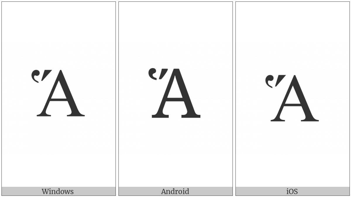 The image below shows how the “Greek Capital Letter Alpha With Dasia And Oxia” symbol might look like on different operating systems. If the font in which this web site is displayed does not contain the symbol and there is no fallback font able to render it, you can use the image below to get an idea of what it should look like.