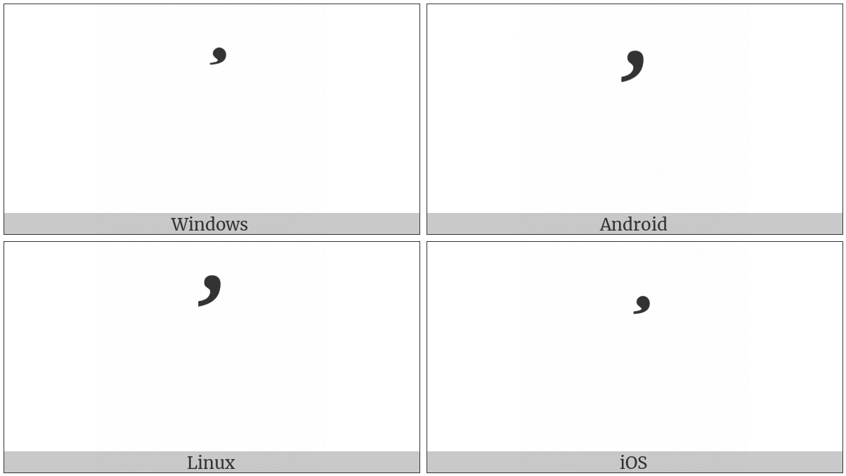 The image below shows how the “Combining Horn” symbol might look like on different operating systems. If the font in which this web site is displayed does not contain the symbol and there is no fallback font able to render it, you can use the image below to get an idea of what it should look like.