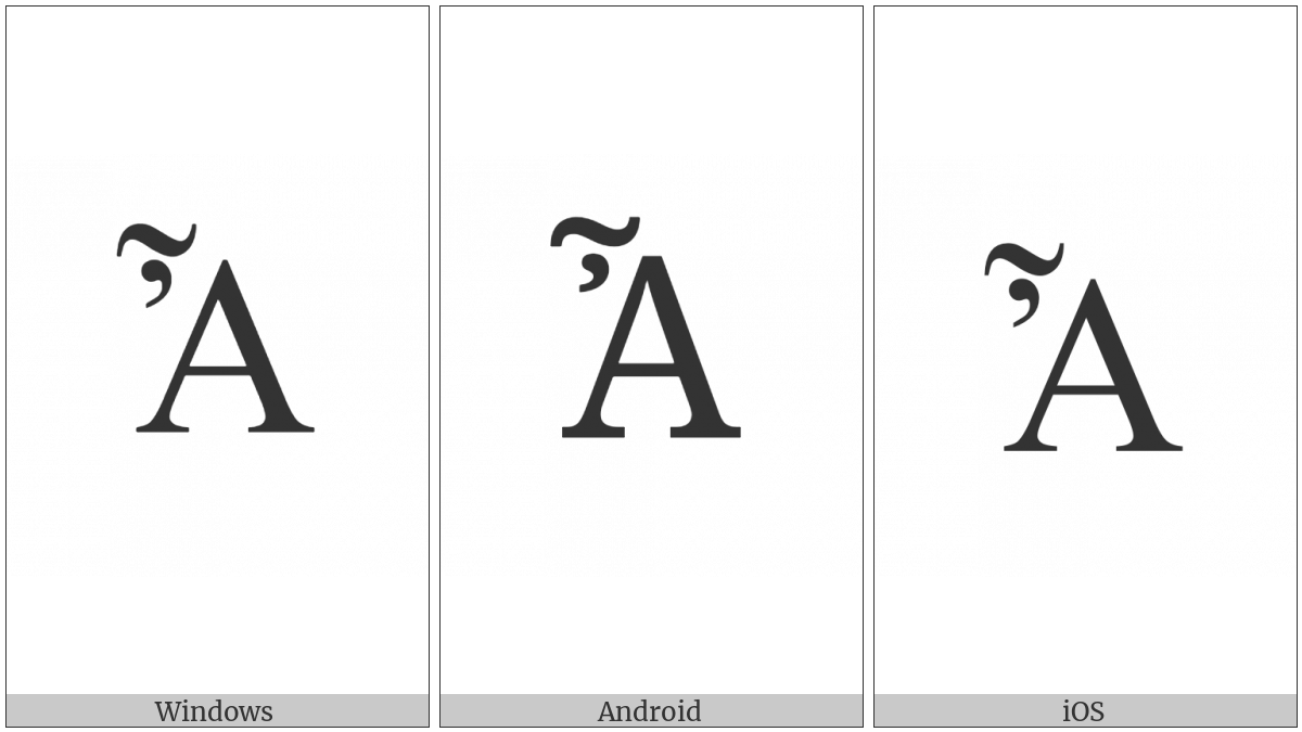 The image below shows how the “Greek Capital Letter Alpha With Psili And Perispomeni” symbol might look like on different operating systems. If the font in which this web site is displayed does not contain the symbol and there is no fallback font able to render it, you can use the image below to get an idea of what it should look like.