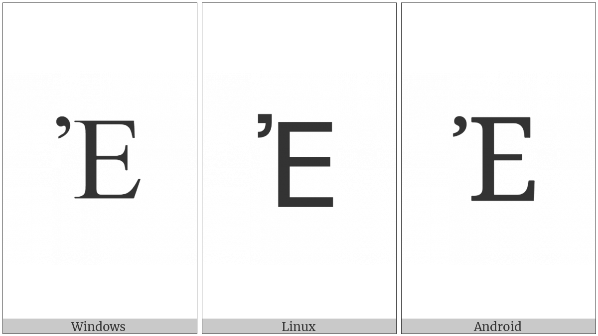The image below shows how the “Greek Capital Letter Epsilon With Psili” symbol might look like on different operating systems. If the font in which this web site is displayed does not contain the symbol and there is no fallback font able to render it, you can use the image below to get an idea of what it should look like.