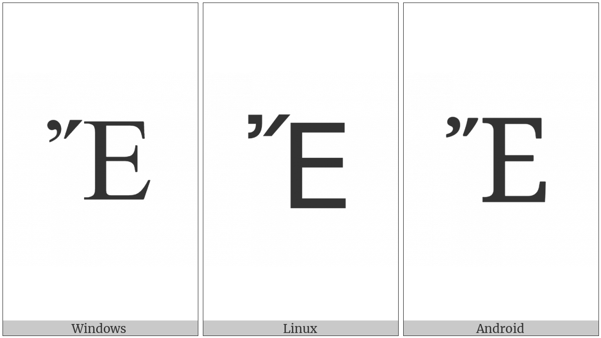 The image below shows how the “Greek Capital Letter Epsilon With Psili And Oxia” symbol might look like on different operating systems. If the font in which this web site is displayed does not contain the symbol and there is no fallback font able to render it, you can use the image below to get an idea of what it should look like.