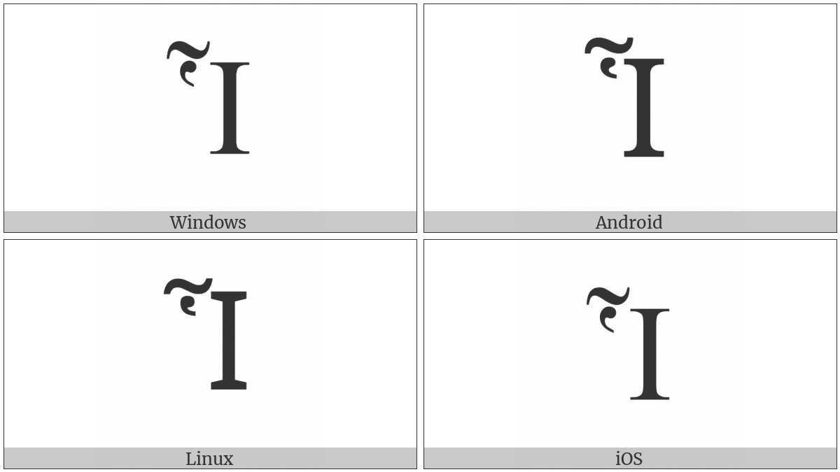 The image below shows how the “Greek Capital Letter Iota With Dasia And Perispomeni” symbol might look like on different operating systems. If the font in which this web site is displayed does not contain the symbol and there is no fallback font able to render it, you can use the image below to get an idea of what it should look like.
