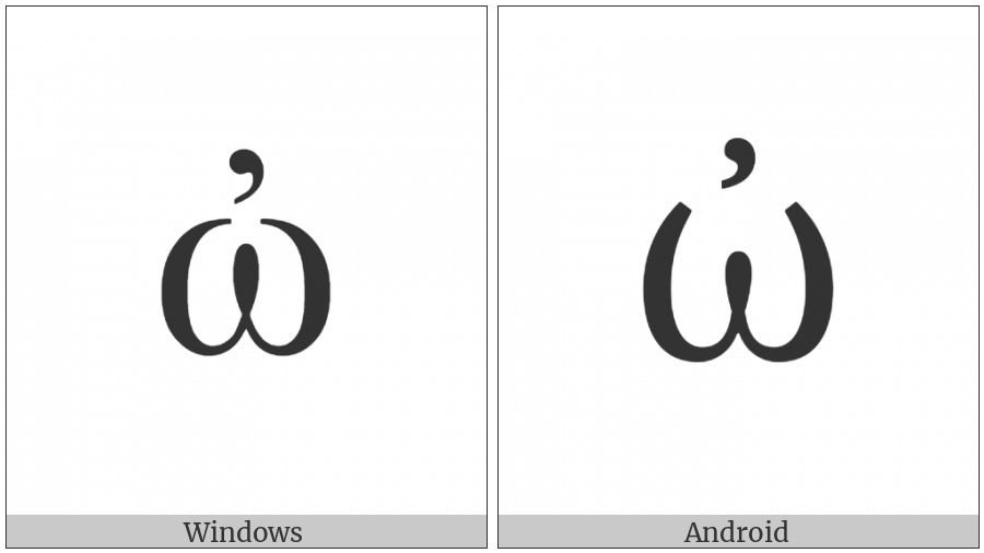 The image below shows how the “Greek Small Letter Omega With Psili” symbol might look like on different operating systems. If the font in which this web site is displayed does not contain the symbol and there is no fallback font able to render it, you can use the image below to get an idea of what it should look like.