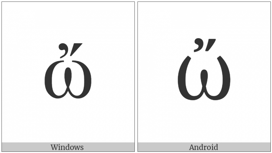 The image below shows how the “Greek Small Letter Omega With Psili And Oxia” symbol might look like on different operating systems. If the font in which this web site is displayed does not contain the symbol and there is no fallback font able to render it, you can use the image below to get an idea of what it should look like.