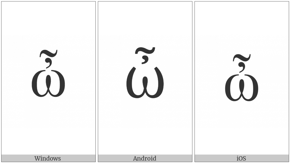 The image below shows how the “Greek Small Letter Omega With Psili And Perispomeni” symbol might look like on different operating systems. If the font in which this web site is displayed does not contain the symbol and there is no fallback font able to render it, you can use the image below to get an idea of what it should look like.