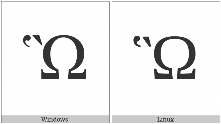 The image below shows how the “Greek Capital Letter Omega With Dasia And Varia” symbol might look like on different operating systems. If the font in which this web site is displayed does not contain the symbol and there is no fallback font able to render it, you can use the image below to get an idea of what it should look like.