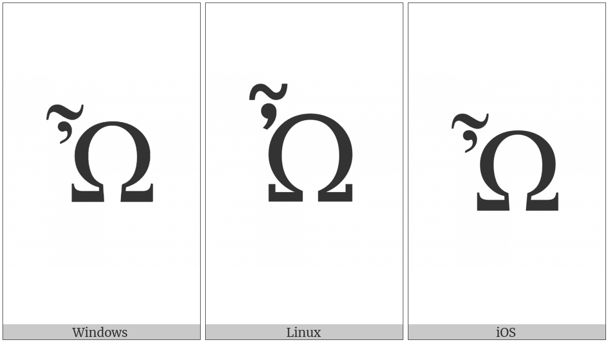 The image below shows how the “Greek Capital Letter Omega With Psili And Perispomeni” symbol might look like on different operating systems. If the font in which this web site is displayed does not contain the symbol and there is no fallback font able to render it, you can use the image below to get an idea of what it should look like.