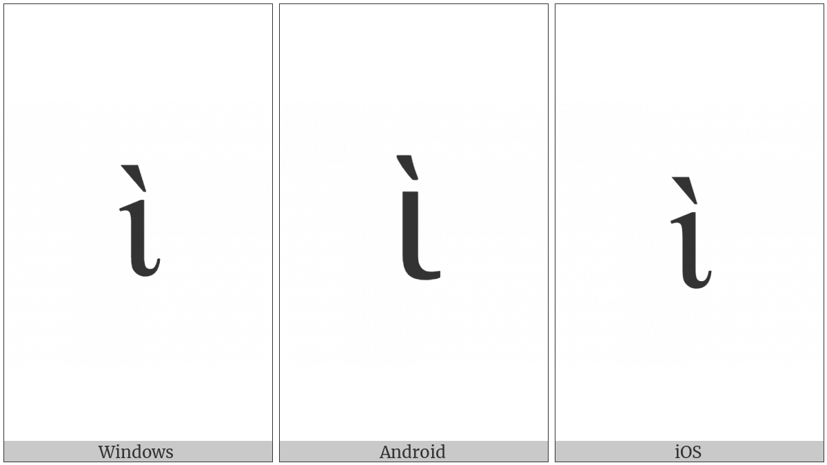 The image below shows how the “Greek Small Letter Iota With Varia” symbol might look like on different operating systems. If the font in which this web site is displayed does not contain the symbol and there is no fallback font able to render it, you can use the image below to get an idea of what it should look like.
