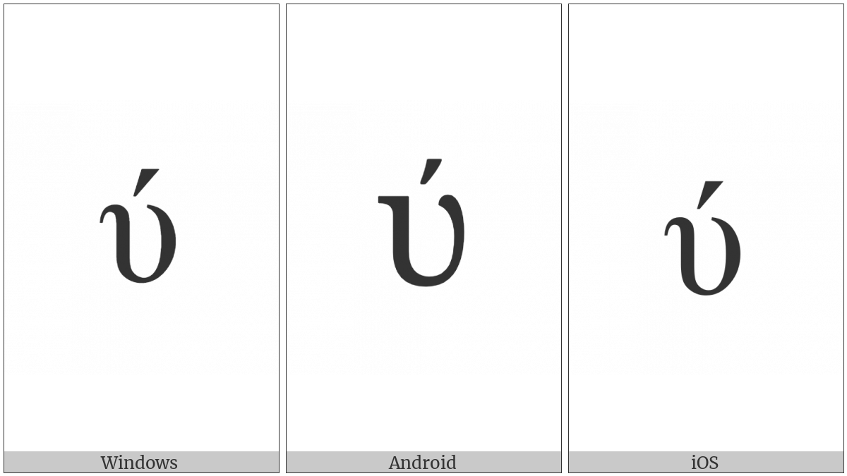 The image below shows how the “Greek Small Letter Upsilon With Oxia” symbol might look like on different operating systems. If the font in which this web site is displayed does not contain the symbol and there is no fallback font able to render it, you can use the image below to get an idea of what it should look like.