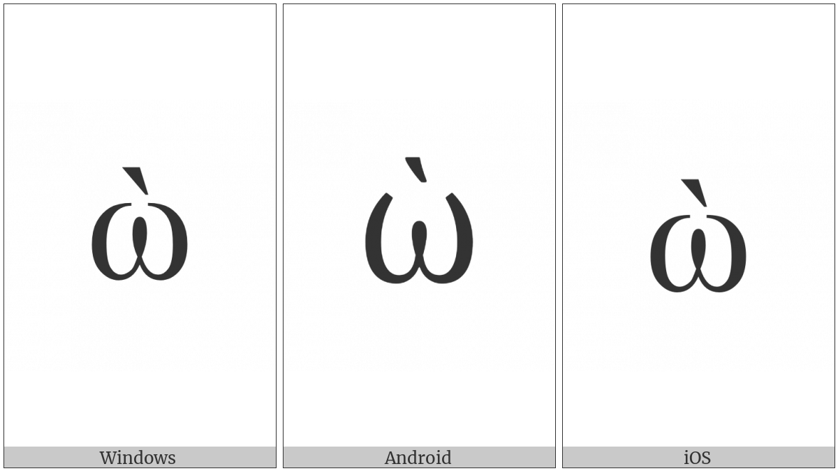The image below shows how the “Greek Small Letter Omega With Varia” symbol might look like on different operating systems. If the font in which this web site is displayed does not contain the symbol and there is no fallback font able to render it, you can use the image below to get an idea of what it should look like.