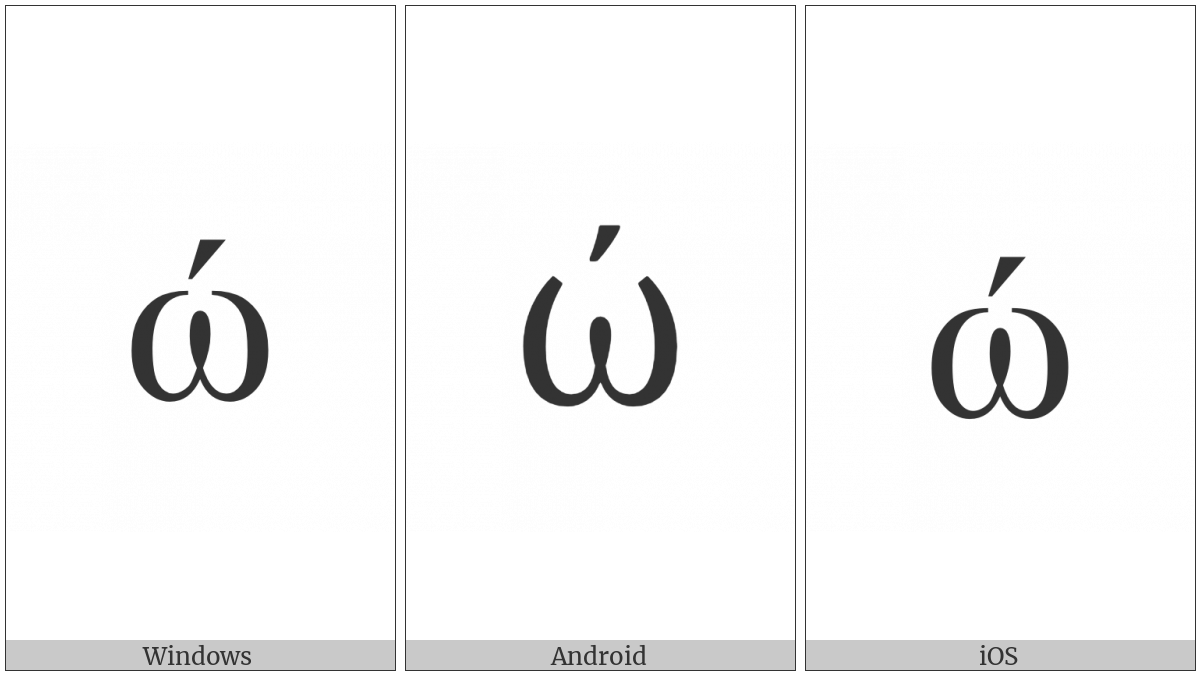 The image below shows how the “Greek Small Letter Omega With Oxia” symbol might look like on different operating systems. If the font in which this web site is displayed does not contain the symbol and there is no fallback font able to render it, you can use the image below to get an idea of what it should look like.