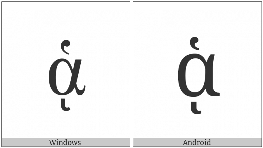 The image below shows how the “Greek Small Letter Alpha With Dasia And Ypogegrammeni” symbol might look like on different operating systems. If the font in which this web site is displayed does not contain the symbol and there is no fallback font able to render it, you can use the image below to get an idea of what it should look like.