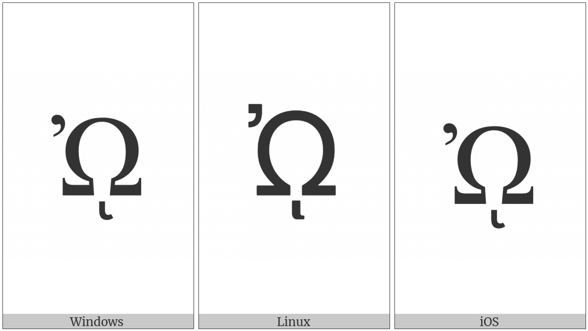 The image below shows how the “Greek Capital Letter Omega With Psili And Prosgegrammeni” symbol might look like on different operating systems. If the font in which this web site is displayed does not contain the symbol and there is no fallback font able to render it, you can use the image below to get an idea of what it should look like.