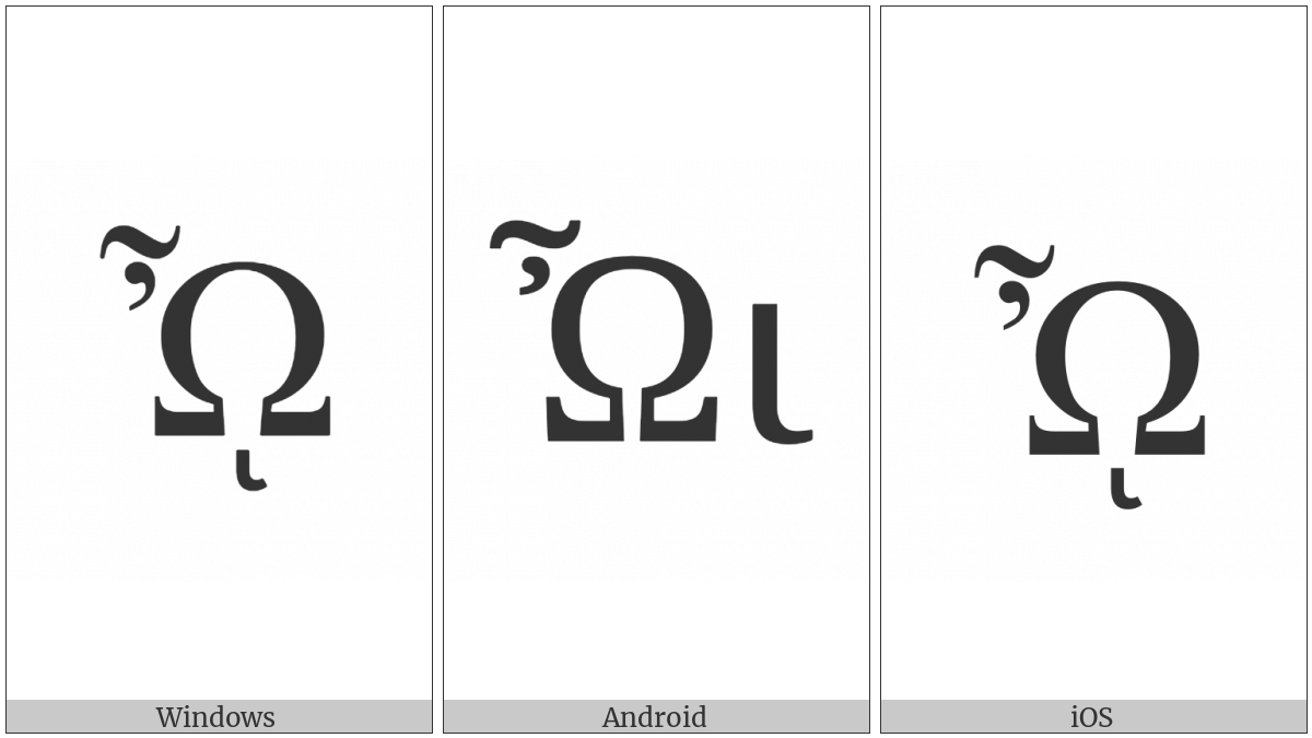 The image below shows how the “Greek Capital Letter Omega With Psili And Perispomeni And Prosgegrammeni” symbol might look like on different operating systems. If the font in which this web site is displayed does not contain the symbol and there is no fallback font able to render it, you can use the image below to get an idea of what it should look like.