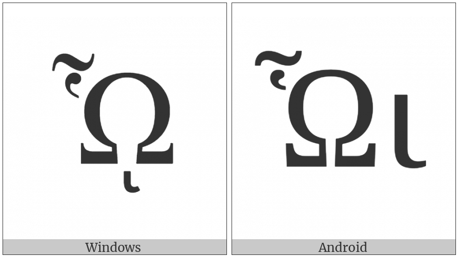 The image below shows how the “Greek Capital Letter Omega With Dasia And Perispomeni And Prosgegrammeni” symbol might look like on different operating systems. If the font in which this web site is displayed does not contain the symbol and there is no fallback font able to render it, you can use the image below to get an idea of what it should look like.
