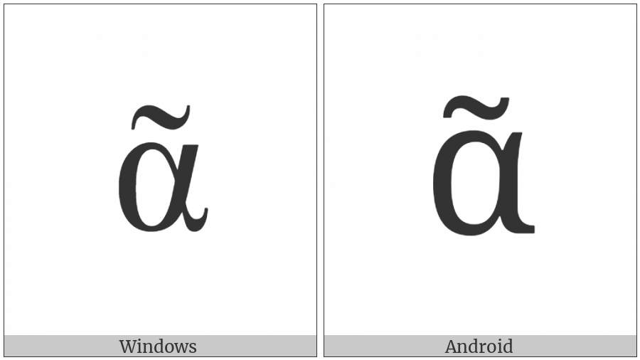 The image below shows how the “Greek Small Letter Alpha With Perispomeni” symbol might look like on different operating systems. If the font in which this web site is displayed does not contain the symbol and there is no fallback font able to render it, you can use the image below to get an idea of what it should look like.
