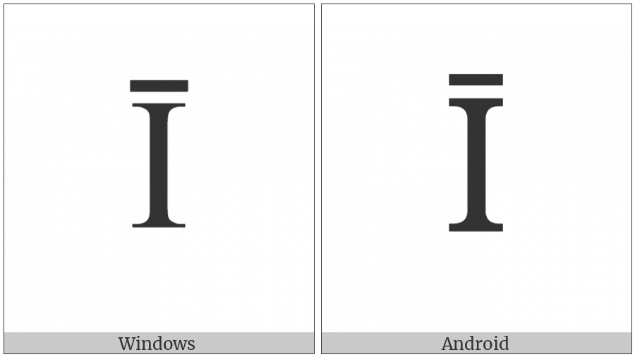 The image below shows how the “Greek Capital Letter Iota With Macron” symbol might look like on different operating systems. If the font in which this web site is displayed does not contain the symbol and there is no fallback font able to render it, you can use the image below to get an idea of what it should look like.