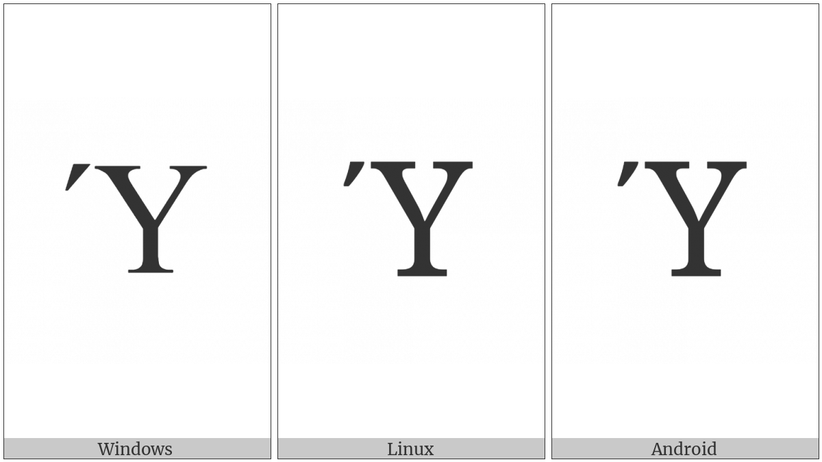 The image below shows how the “Greek Capital Letter Upsilon With Oxia” symbol might look like on different operating systems. If the font in which this web site is displayed does not contain the symbol and there is no fallback font able to render it, you can use the image below to get an idea of what it should look like.