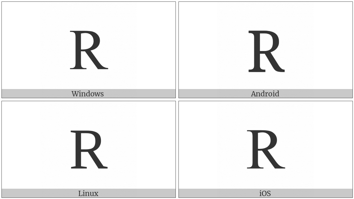 The image below shows how the “Latin Capital Letter R” symbol might look like on different operating systems. If the font in which this web site is displayed does not contain the symbol and there is no fallback font able to render it, you can use the image below to get an idea of what it should look like.