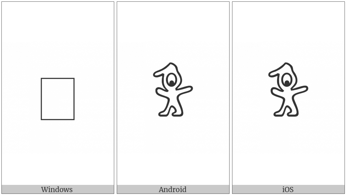 The image below shows how the “Anatolian Hieroglyph A005” symbol might look like on different operating systems. If the font in which this web site is displayed does not contain the symbol and there is no fallback font able to render it, you can use the image below to get an idea of what it should look like.