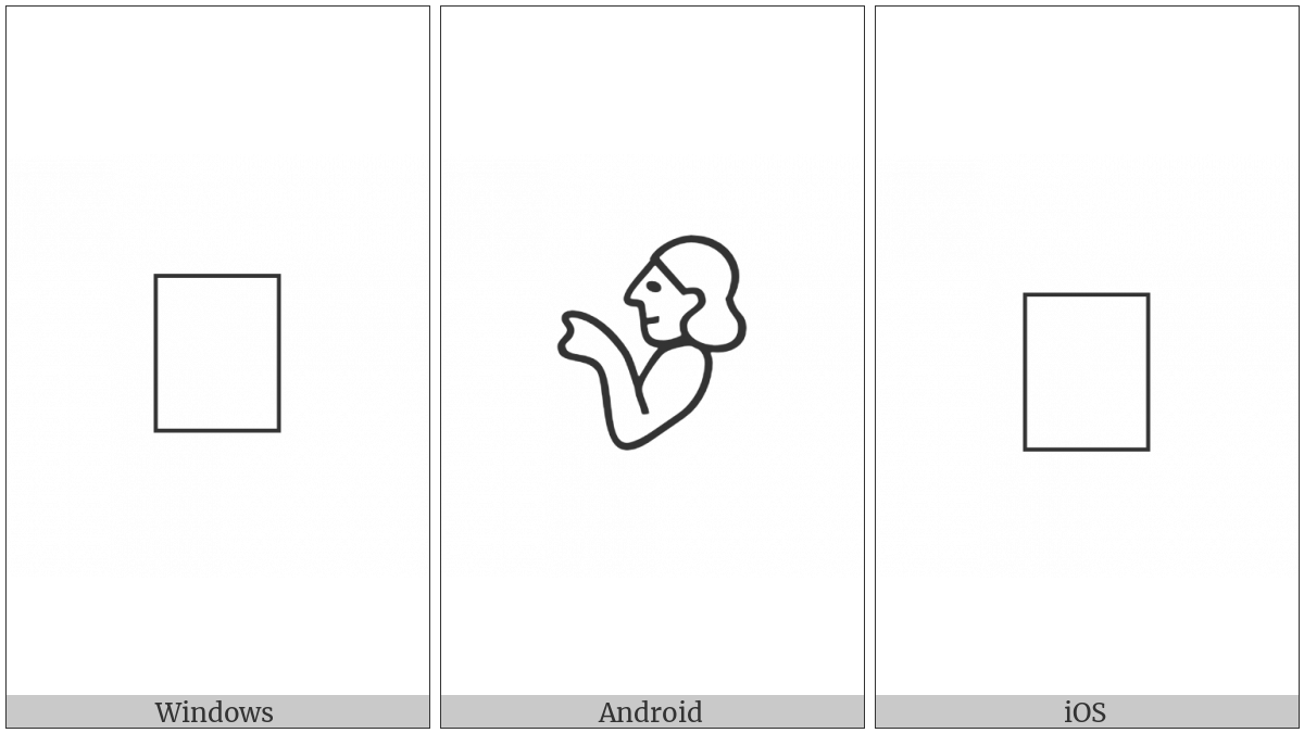 The image below shows how the “Anatolian Hieroglyph A006” symbol might look like on different operating systems. If the font in which this web site is displayed does not contain the symbol and there is no fallback font able to render it, you can use the image below to get an idea of what it should look like.