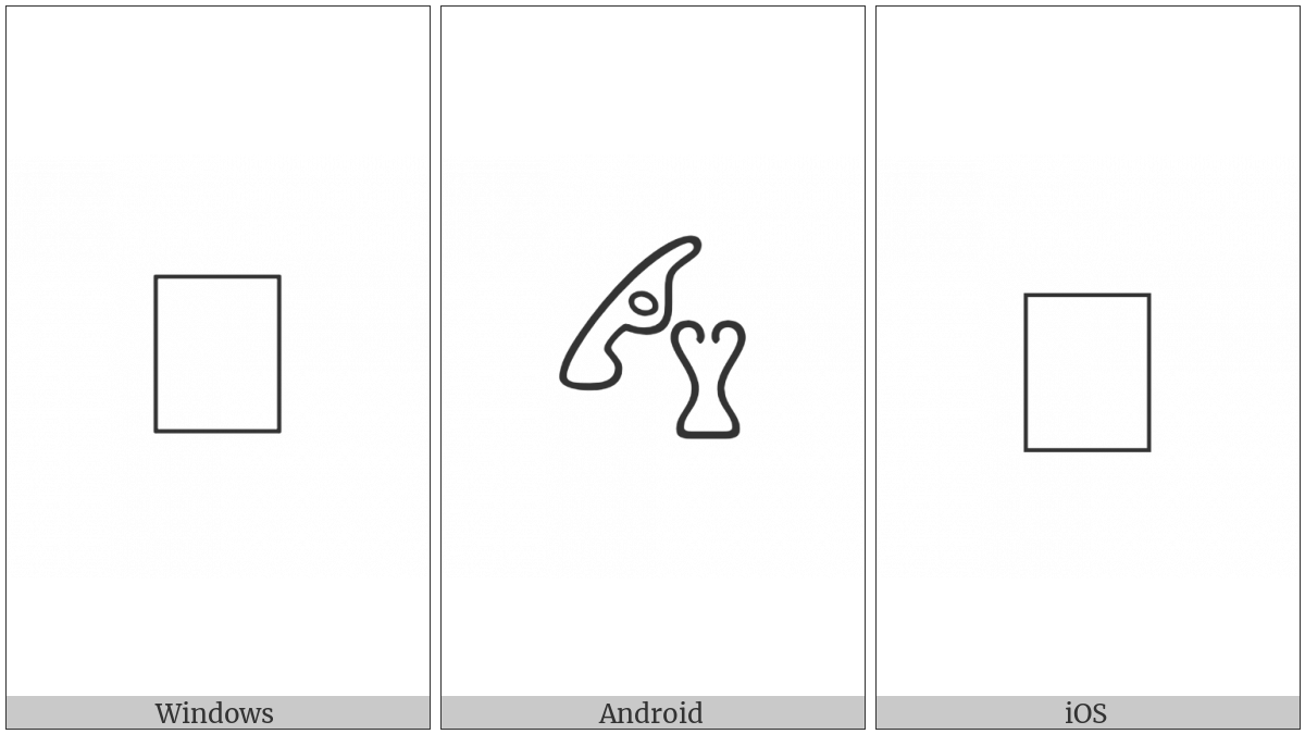 The image below shows how the “Anatolian Hieroglyph A026A” symbol might look like on different operating systems. If the font in which this web site is displayed does not contain the symbol and there is no fallback font able to render it, you can use the image below to get an idea of what it should look like.