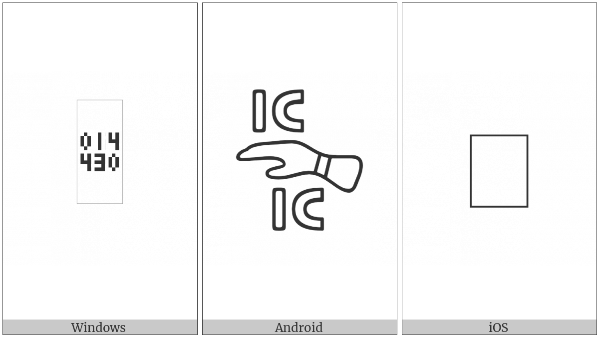 The image below shows how the “Anatolian Hieroglyph A045” symbol might look like on different operating systems. If the font in which this web site is displayed does not contain the symbol and there is no fallback font able to render it, you can use the image below to get an idea of what it should look like.