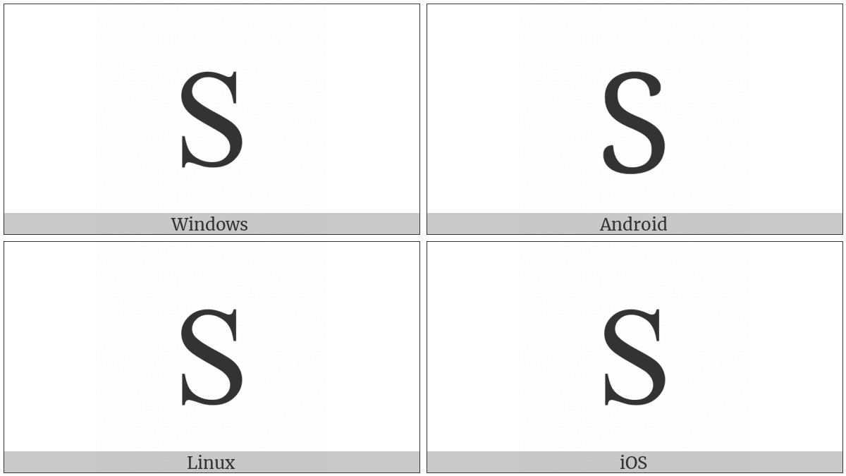 The image below shows how the “Latin Capital Letter S” symbol might look like on different operating systems. If the font in which this web site is displayed does not contain the symbol and there is no fallback font able to render it, you can use the image below to get an idea of what it should look like.