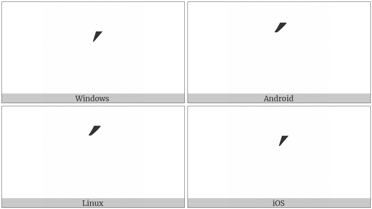 The image below shows how the “Combining Acute Tone Mark” symbol might look like on different operating systems. If the font in which this web site is displayed does not contain the symbol and there is no fallback font able to render it, you can use the image below to get an idea of what it should look like.
