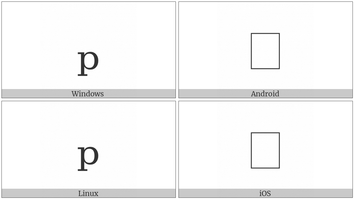 The image below shows how the “Latin Subscript Small Letter P” symbol might look like on different operating systems. If the font in which this web site is displayed does not contain the symbol and there is no fallback font able to render it, you can use the image below to get an idea of what it should look like.