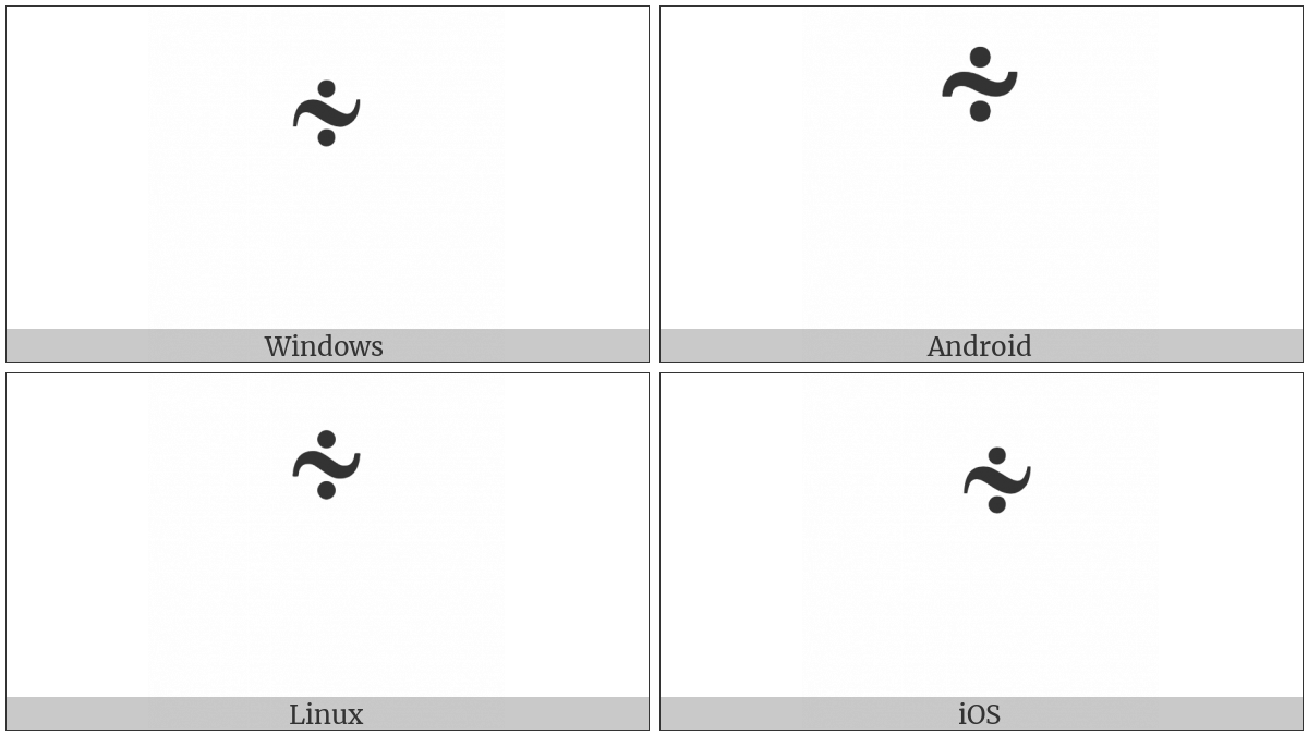 The image below shows how the “Combining Homothetic Above” symbol might look like on different operating systems. If the font in which this web site is displayed does not contain the symbol and there is no fallback font able to render it, you can use the image below to get an idea of what it should look like.