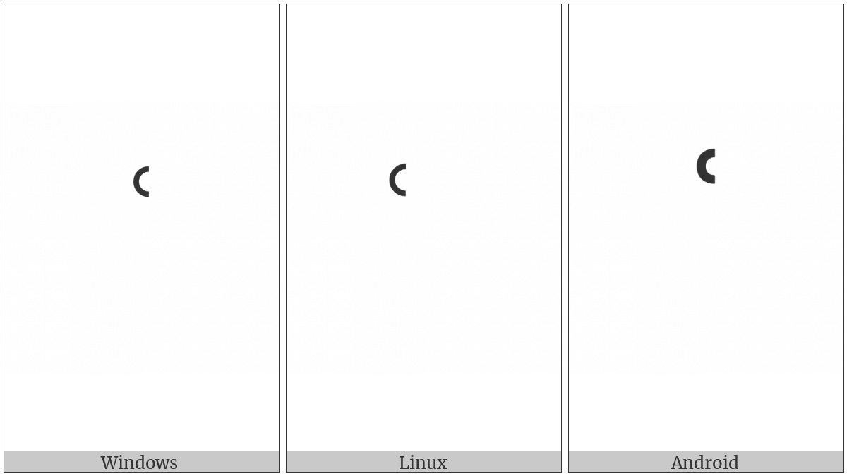 The image below shows how the “Combining Left Half Ring Above” symbol might look like on different operating systems. If the font in which this web site is displayed does not contain the symbol and there is no fallback font able to render it, you can use the image below to get an idea of what it should look like.