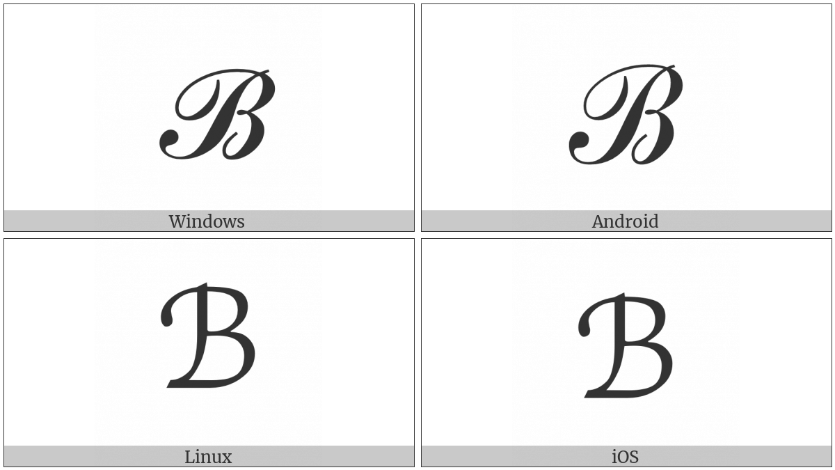 The image below shows how the “Script Capital B” symbol might look like on different operating systems. If the font in which this web site is displayed does not contain the symbol and there is no fallback font able to render it, you can use the image below to get an idea of what it should look like.