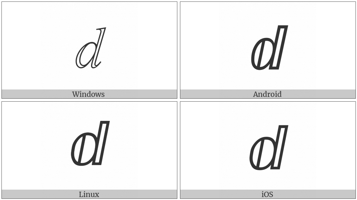 The image below shows how the “Double-Struck Italic Small D” symbol might look like on different operating systems. If the font in which this web site is displayed does not contain the symbol and there is no fallback font able to render it, you can use the image below to get an idea of what it should look like.