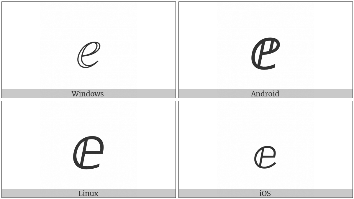 The image below shows how the “Double-Struck Italic Small E” symbol might look like on different operating systems. If the font in which this web site is displayed does not contain the symbol and there is no fallback font able to render it, you can use the image below to get an idea of what it should look like.