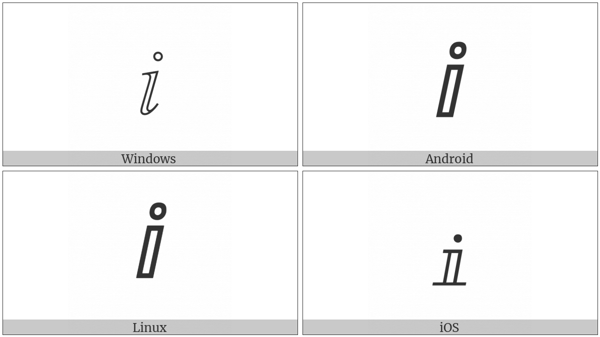 The image below shows how the “Double-Struck Italic Small I” symbol might look like on different operating systems. If the font in which this web site is displayed does not contain the symbol and there is no fallback font able to render it, you can use the image below to get an idea of what it should look like.