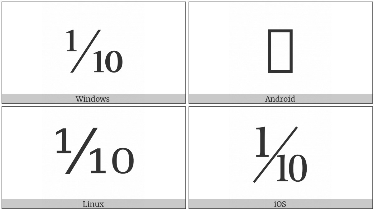 The image below shows how the “Vulgar Fraction One Tenth” symbol might look like on different operating systems. If the font in which this web site is displayed does not contain the symbol and there is no fallback font able to render it, you can use the image below to get an idea of what it should look like.