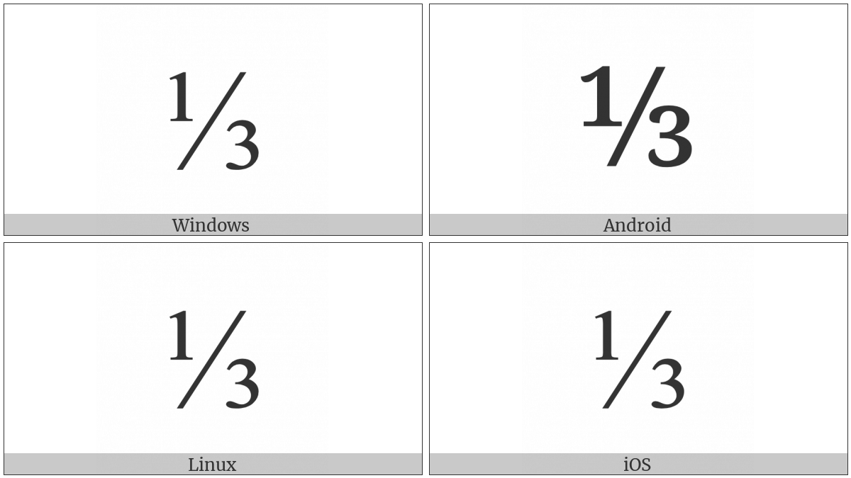 The image below shows how the “Vulgar Fraction One Third” symbol might look like on different operating systems. If the font in which this web site is displayed does not contain the symbol and there is no fallback font able to render it, you can use the image below to get an idea of what it should look like.