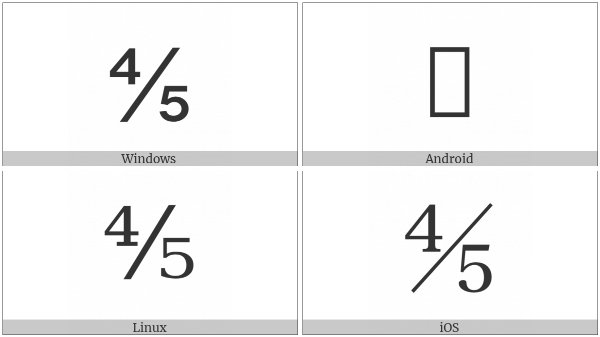 The image below shows how the “Vulgar Fraction Four Fifths” symbol might look like on different operating systems. If the font in which this web site is displayed does not contain the symbol and there is no fallback font able to render it, you can use the image below to get an idea of what it should look like.