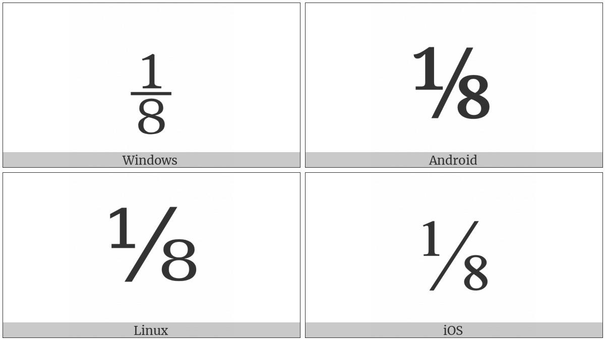 The image below shows how the “Vulgar Fraction One Eighth” symbol might look like on different operating systems. If the font in which this web site is displayed does not contain the symbol and there is no fallback font able to render it, you can use the image below to get an idea of what it should look like.