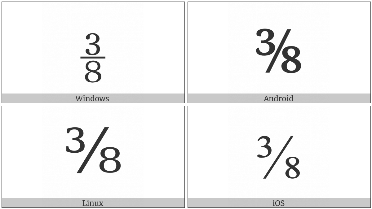The image below shows how the “Vulgar Fraction Three Eighths” symbol might look like on different operating systems. If the font in which this web site is displayed does not contain the symbol and there is no fallback font able to render it, you can use the image below to get an idea of what it should look like.
