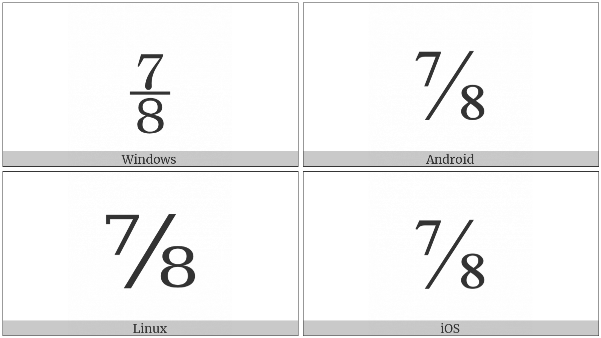 The image below shows how the “Vulgar Fraction Seven Eighths” symbol might look like on different operating systems. If the font in which this web site is displayed does not contain the symbol and there is no fallback font able to render it, you can use the image below to get an idea of what it should look like.