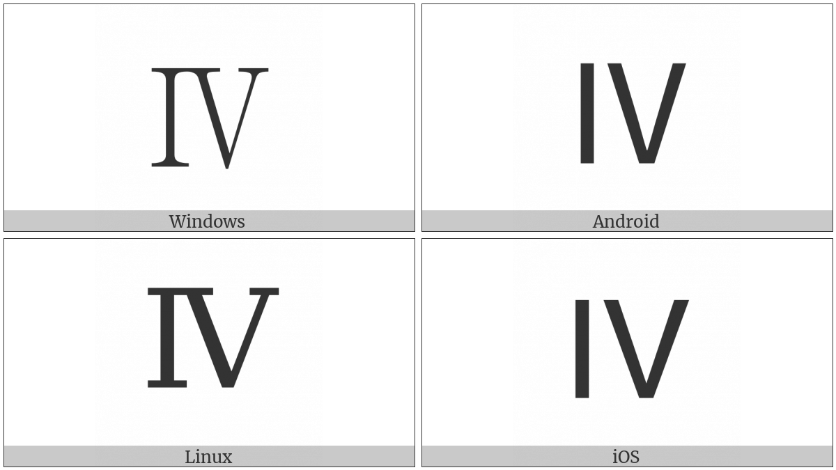 The image below shows how the “Roman Numeral Four” symbol might look like on different operating systems. If the font in which this web site is displayed does not contain the symbol and there is no fallback font able to render it, you can use the image below to get an idea of what it should look like.