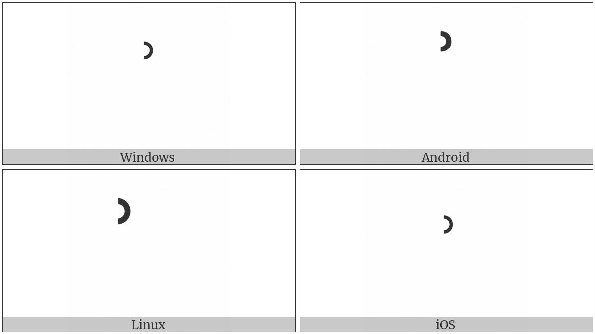 The image below shows how the “Combining Right Half Ring Above” symbol might look like on different operating systems. If the font in which this web site is displayed does not contain the symbol and there is no fallback font able to render it, you can use the image below to get an idea of what it should look like.
