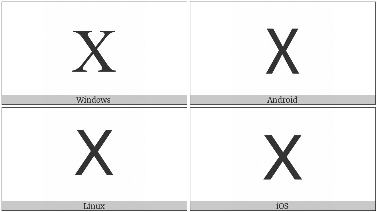 The image below shows how the “Roman Numeral Ten” symbol might look like on different operating systems. If the font in which this web site is displayed does not contain the symbol and there is no fallback font able to render it, you can use the image below to get an idea of what it should look like.