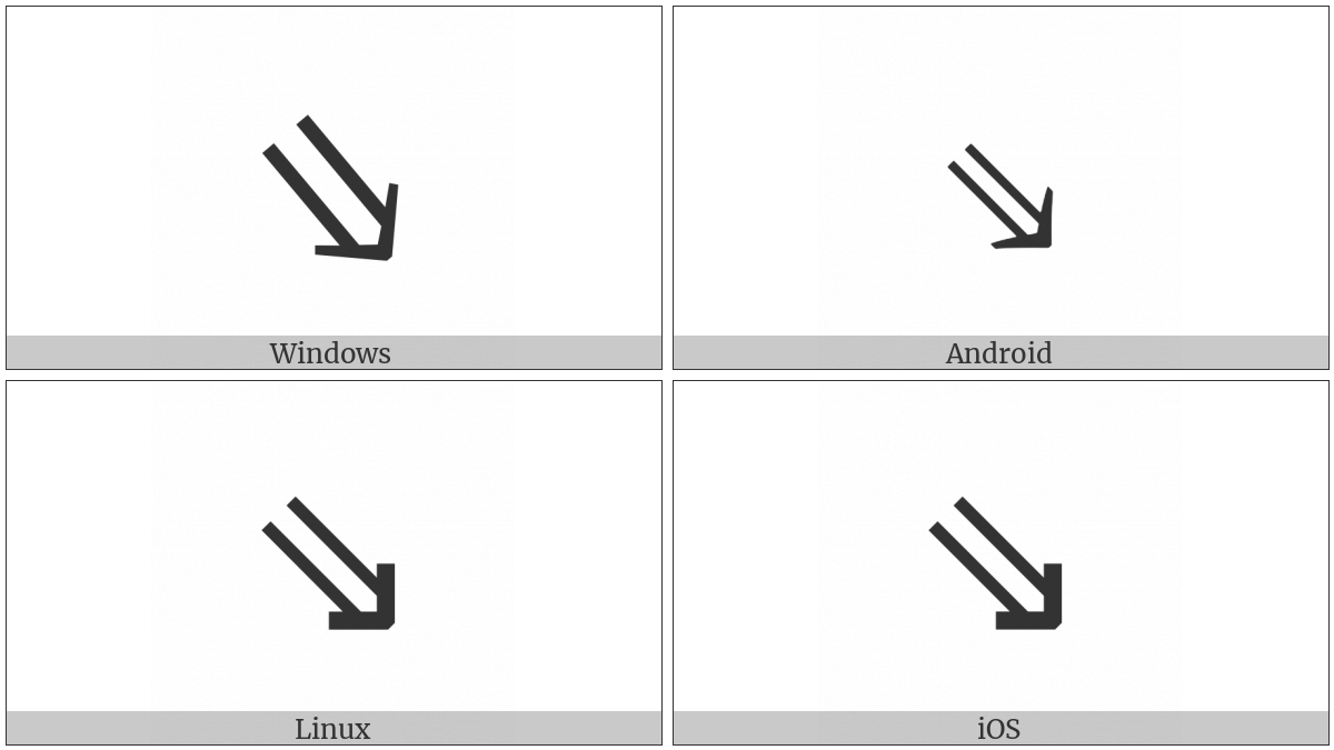 The image below shows how the “South East Double Arrow” symbol might look like on different operating systems. If the font in which this web site is displayed does not contain the symbol and there is no fallback font able to render it, you can use the image below to get an idea of what it should look like.