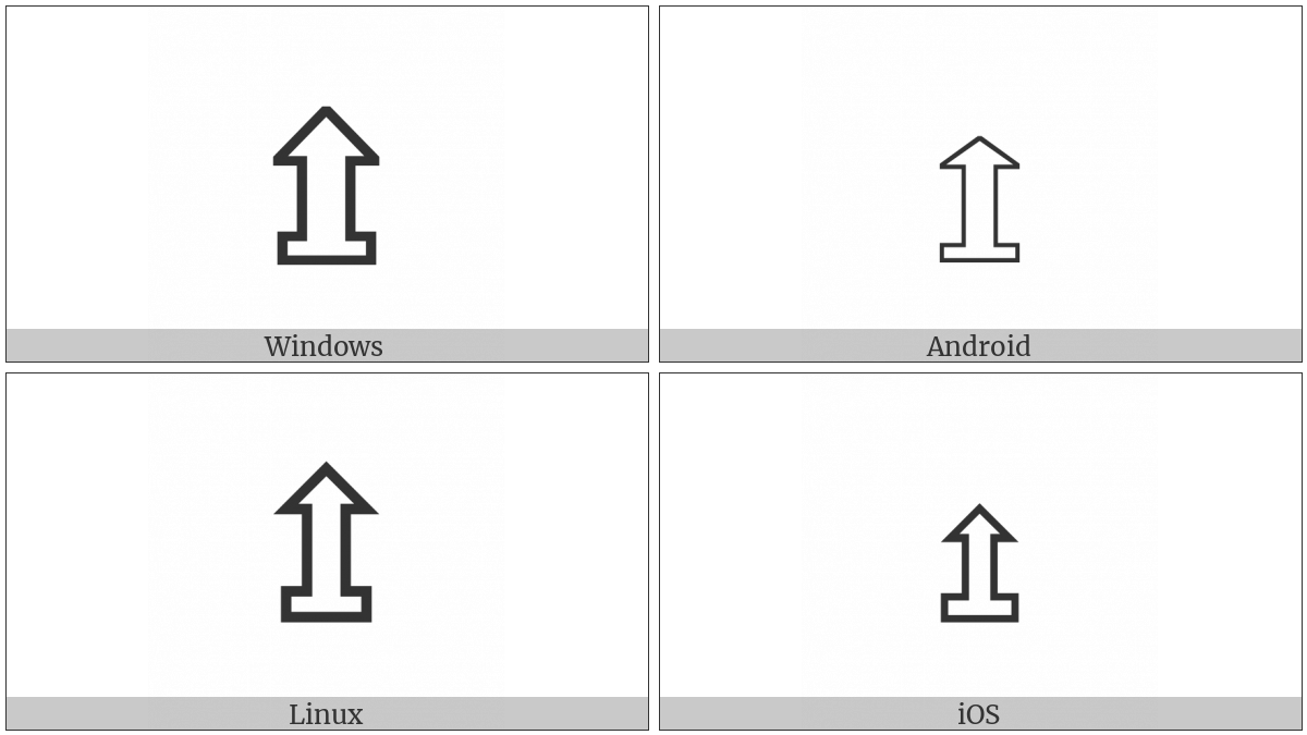 The image below shows how the “Upwards White Arrow On Pedestal” symbol might look like on different operating systems. If the font in which this web site is displayed does not contain the symbol and there is no fallback font able to render it, you can use the image below to get an idea of what it should look like.